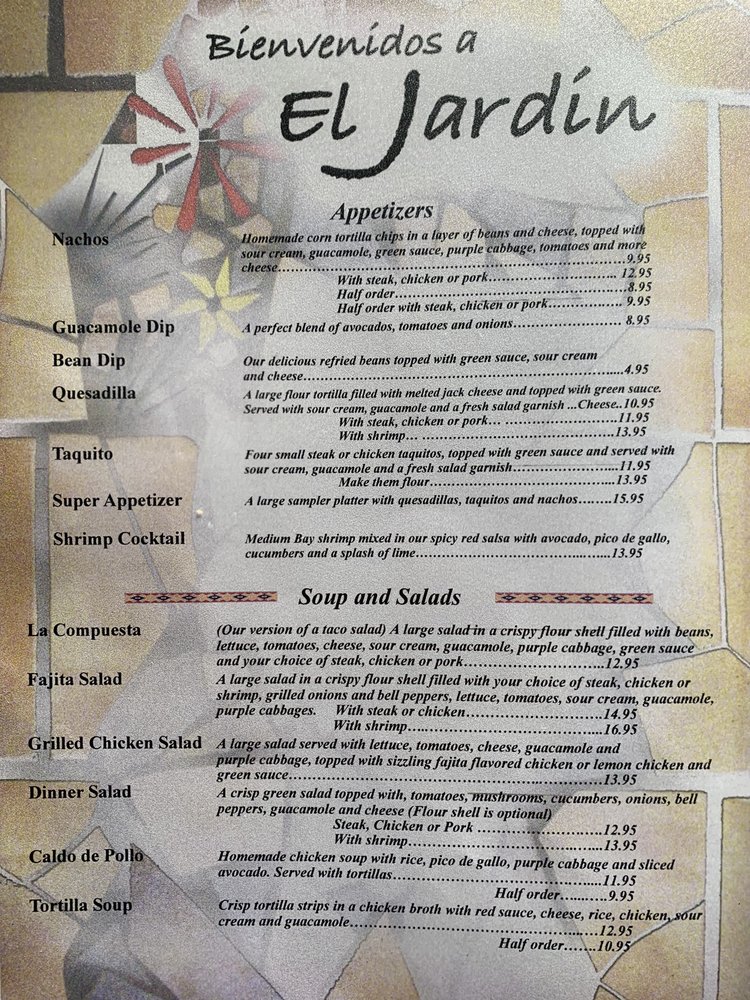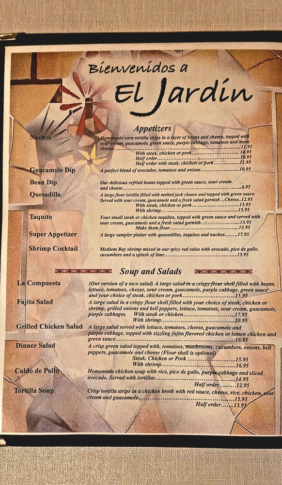 El Jardin, located in Turlock, CA, offers a variety of Mexican dishes in a casual setting with outdoor seating. This restaurant accepts reservations, takeout, and delivery, making it convenient for all diners. With a menu filled with vegetarian options and a full bar, El Jardin is perfect for groups, kids, and both lunch and dinner outings. The Nachos, Guacamole Dip, and La Compuesta taco salad are highly recommended, according to customer reviews. The ambiance is charming and the service is friendly, creating a truly delightful dining experience. Whether you're looking for sizzling fajitas or traditional enchiladas, El Jardin is a gem in downtown Turlock. Experience the enchanting atmosphere and consistently delicious food at this hidden charm of a restaurant.